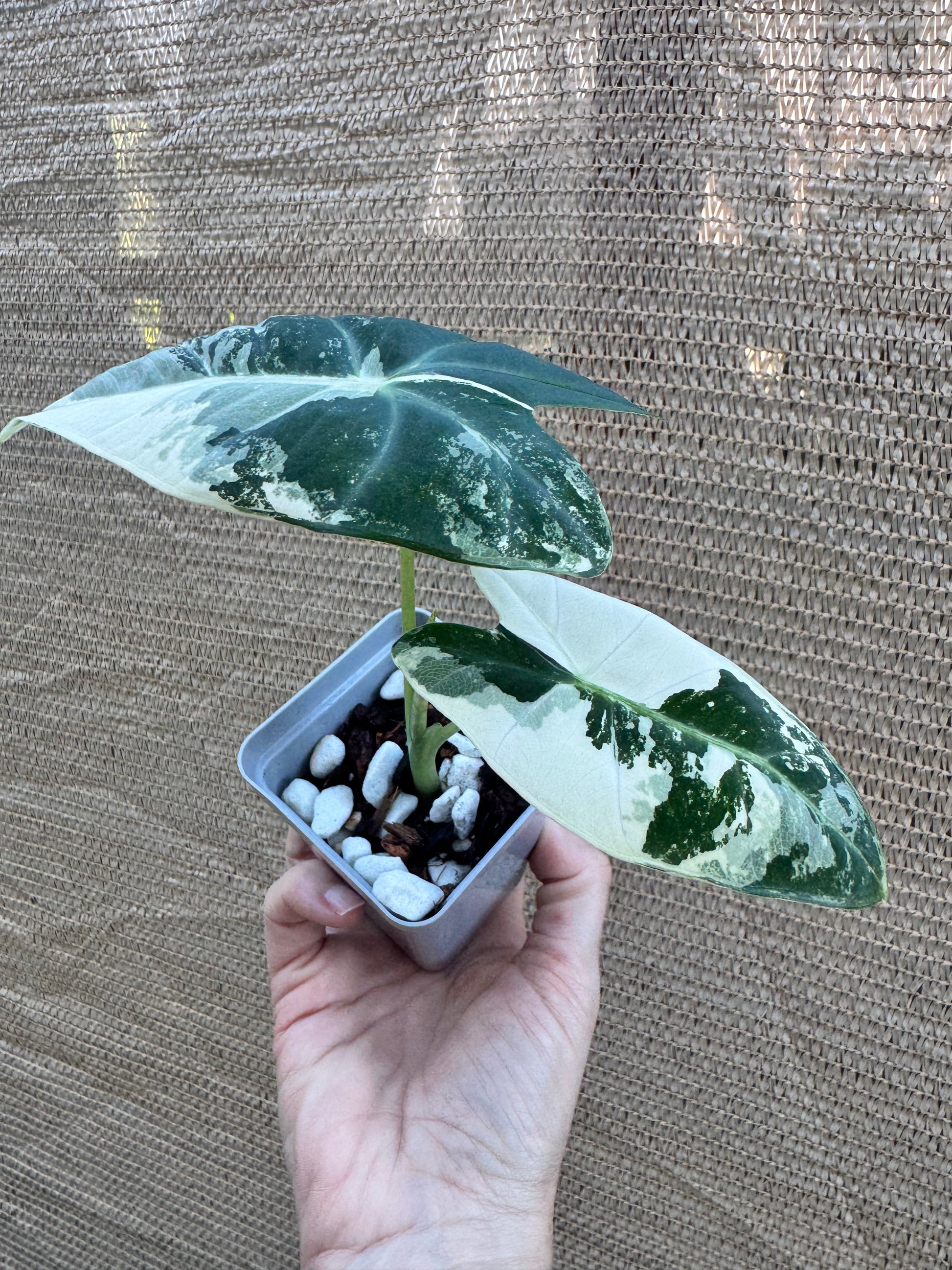 Variegated Alocasia Frydek is a rare and stunning plant known for its velvety green leaves accented with striking white or cream variegation and bold veining. It thrives in bright, indirect light—too little light can cause the variegation to fade, while direct sun can scorch its delicate leaves. Use a well-draining, airy soil mix and keep the soil consistently moist but never soggy. High humidity and regular feeding during the growing season will help support healthy, vibrant growth. Buyer will receive plant similar to one pictured in 2.4" pot with 2-3 leaves.